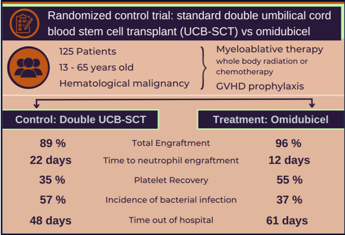 The company published their Phase III clinical data in Blood, in October 2021. The randomized control trial tested the efficacy of omidubicel (n=62) versus standard double UCB-SC transplant (n=63) in adult and pediatric patients with hematological malignancies. Patients were required to have an HLA-matched UCB donor and not have any anti-donor antibodies, as the use of cord blood does not remove the need for proper matching. All patients underwent one of three permitted myeloablative therapies prior to transplantation, and had the same graft versus host disease (GVHD)-prophylaxis regimen. Treatment with omidubicel had higher overall engraftment rates than standard double UCB-SC, and a significantly shorter time to neutrophil engraftment. Secondary endpoints included platelet recovery by 42 days, incidence of first bacterial infection, and time out of hospital during the first 100 days post-transplant – all of which had significantly improved measures in the treatment arm. There was a slightly higher number of cases of GVHD and disease relapse in the omidubicel arm, but this was not found to be statistically significant.