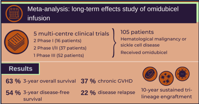 To expand on the longer-term safety and efficacy of omidubicel, a more recent long-term effects study was published in Transplantation and Cellular Therapy in May 2023. This study was a pooled analysis of patients receiving omidubicel across several multi-centre clinical trials. The three-year overall survival and disease-free survival was 62.5% and 54.0%, respectively. Most commonly, causes of mortality or morbidity were related to disease relapse, serious infection, or chronic GVHD. Patients who were 10 years post-engraftment had well-established hematopoetic lineages of red blood cells, platelets and white blood cells (including helper and killer T cells, B cells and natural killer cells). This study did not include comparison values for control groups – likely since only one of the included trials would have had a non-omidubicel control – so it is unclear whether the status of the omidubicel-treated patients is significantly different from those who would have received conventional double UCB-SC therapy. However, the long-term presence of immune cells is encouraging.