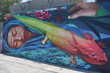 Axolotl mural in Mexico City via Wikimedia Commons, painted and photographed by artist Bryan González.