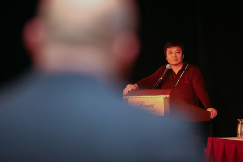 Hongkui Deng fielding questions from the audience at the Till and McCulloch Meetings in Banff, Alberta. Photo: Graham Twomey