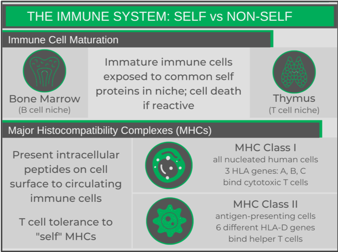 We know that the immune system helps us fight off infections and remove damaged or cancerous cells. And with the exception of autoimmune diseases, it does a pretty good job of leaving our healthy cells alone. But how does the immune system recognize “self” from “non-self”?