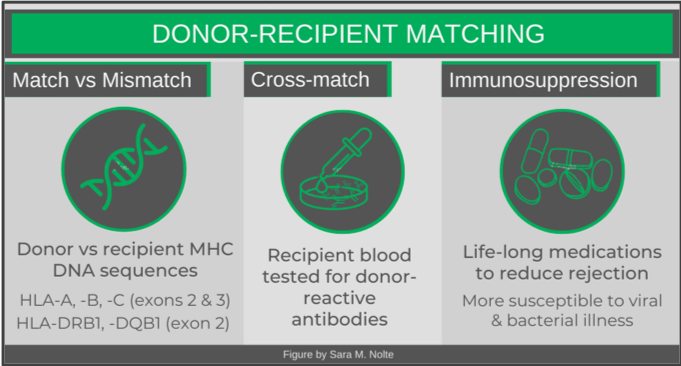 The final step in ensuring a successful organ or stem cell transplant is for the recipient to be on life-long immunosuppressive therapy. While a 10/10 match does significantly reduce the chances of graft failure, there are still numerous donor HLAs that are not identical to the recipient and are recognized as foreign by the recipient’s T cells. There are various types of immunosuppressive medications that will prevent different actions of immune cells. Common mechanisms of these drugs include preventing the expression of cell-signalling molecules, inhibiting cell division, or reducing the mobility of immune cells. Patients are often on a combination of medications to improve the effectiveness of the immunosuppression.
