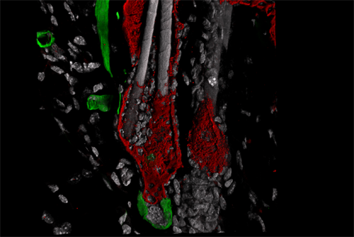 A 3D rendering of a quiescent hair follicle in telogen phase generated using confocal microscopy. Hair follicle dermal stem cells (hfDSCs) are stained with yellow fluorescent protein (YFP) and appear in green at the bottom of the image, just below the dermal papilla (DP). The epithelial compartment of the follicle is stained in red. The arrector pili and blood vessels are also stained green in the upper left area. Image courtesy of Waleed Rahmani, PhD candidate, Biernaskie lab.