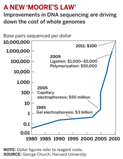 Figure 1: How the cost of sequencing has changed over a 30-year period (source: George Church via Chemical & Engineering News)